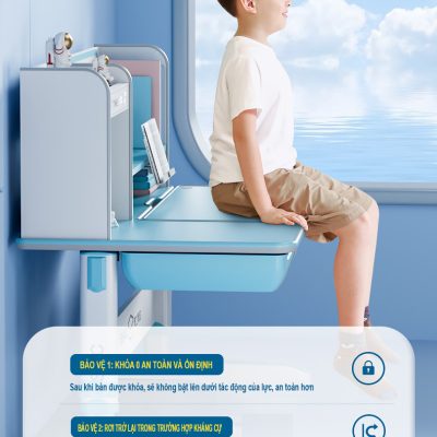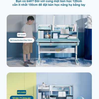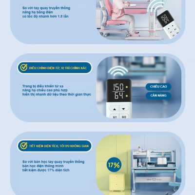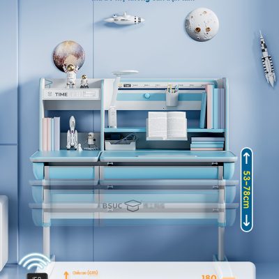 Phụ kiện: Đồng hồ xem giờ, xem lịch, xem nhiệt độ phòng, kệ sách, ngăn bàn, giá đặt sách/ipad, chặn sách, móc treo cặp, đồng hồ hiển thị độ nghiêng, chân bàn có bánh xe di chuyển.